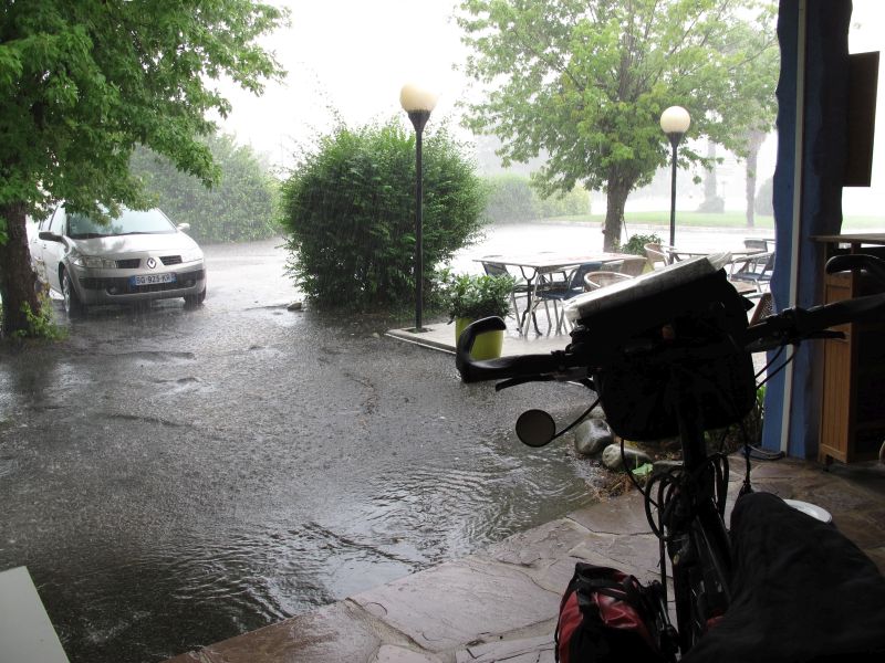 I didn’t know France well ahead of time, now that I am here for almost 2 weeks I have to commit that France is the most positive surprise so far. The people are very friendly. One time after cycling up a long 14% rise in the heat I am spotted by a couple of workers sitting outside having lunch. Once I come close they talk to me and hand me over a glass of red wine, which I have to empty immediately. In the evening I stop and ask a Lady for water, this ended in a dinner with the whole family and a save pace to camp inside a garage. Storms are short but very heavy next to the Pyrenees.